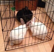 Make sure to have two separate but nearby areas in your household to house the rabbits within sight and smell but out of physical reach while they are learning to get along. Owners often use bricks, small weights, or heavy stone pavers to keep exercise pens apart so that rabbits can't move them close together to bite.