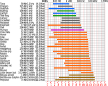 The domestic rabbit is capable of hearing both high and low frequencies and possesses a broad range of best frequencies. Their range of hearing at 60 dB SPL extends from 96 Hz to about 49 kHz.[1]