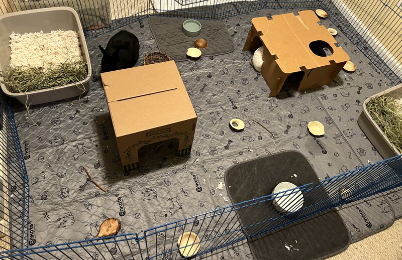 Linus, Maliketh, and Nibbly hanging out in their x-pen setup at their pet-sitter’s house while their bunparents are away on vacation.