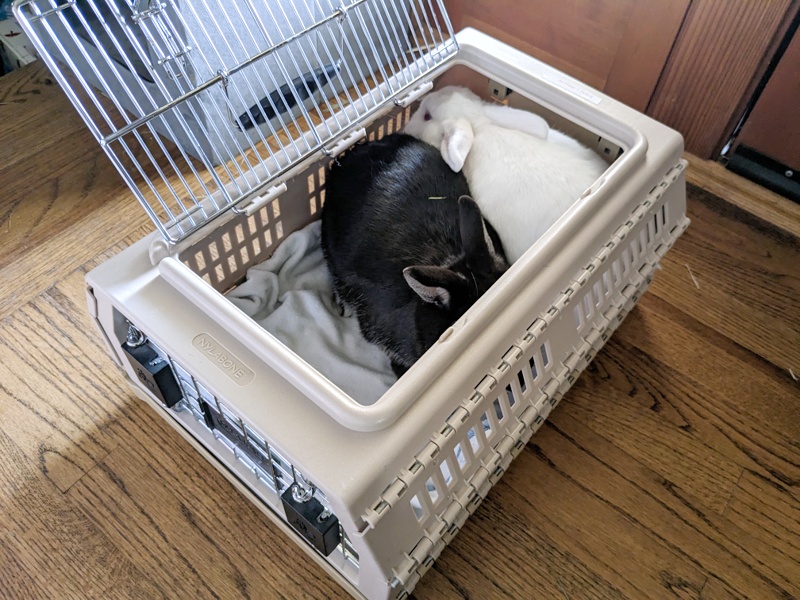 Two 3-4 lb rabbits in a single 17" Nylabone foldable carrier.