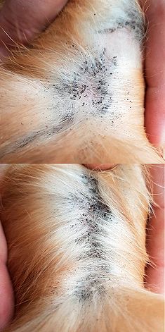 - Small dark spots on the skin indicative of flea feces. Placing a drop of water on one of these spots will result in the dissolving to a red or brown coloration.
