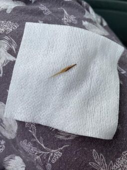 - Lodged in gums. Milo had developed an abscess on his cheek that was thought to maybe be from dental problems. During surgery, they determined it was actually a piece of hay that got lodged into his gums. Milo is ok so far but has a pretty nasty scar on his cheek that we have to watch for the next two weeks. The vet told Milo's parent that "it was just a unfortunate random act that I couldn't have prevented."