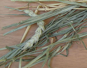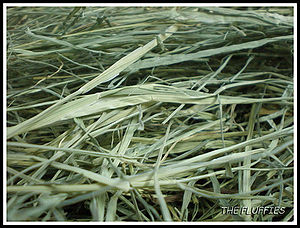 Timothy grass, a perennial bunchgrass, is a cool-season forage grass.[7] Timothy hay is the most popular hay fed to rabbits. It looks like a dried fairly wide blade of grass, and its color is a soft green to grey or brown-green. Timothy hay also has "solid cattails" which distinguishes it from Orchard grass which has "broken cattails."[9]