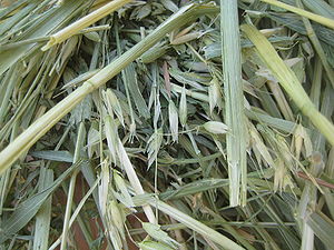 Oat hay can also differ greatly in color from a pale green to a golden yellow, depending on how close to maturity the hay is harvested. The closer to maturity, the more golden the hay will be. A good-quality cereal hay is harvested when the grain is immature (soft dough stage) and the leaves and stems are still green, and therefore higher in digestible nutrients. If the cereal hay is harvested after the grain is removed, it is no longer considered hay but straw.[13]