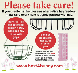 We generally do not recommend the hay bag feeders with large holes for rabbits due to the risk of entanglement and eye injuries. If you do use a rack that rabbits can stick their full face in, please be sure to use soft hays like orchard, teff, and bermuda grass and avoid stalky hays like alfalfa, timothy, and oat.