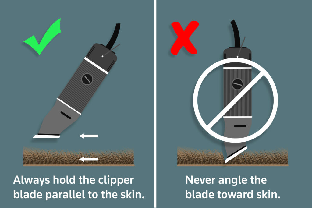 98% of the time we want to move the clipper blade with the grain of the fur, not against the grain. Only move against the grain or across the grain if you can’t get at that fur any other way. We also hold the blade parallel to the rabbit’s skin at all times. Never angle downward, which would point the moving cutting parts of the clipper directly at the rabbit’s skin.