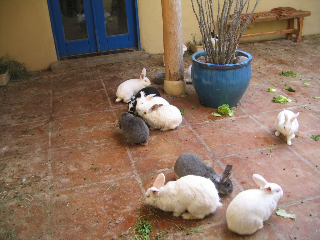 Because we live in an area where there are coyotes and other wild animals, the dogs and cats can’t go outdoors on their own, so they also spend time in the safe courtyard with the rabbits. As the rabbits in the big group get older, and begin to develop some of the neurological and arthritic conditions associated with old age, they “graduate” to move into the main part of the house with us.