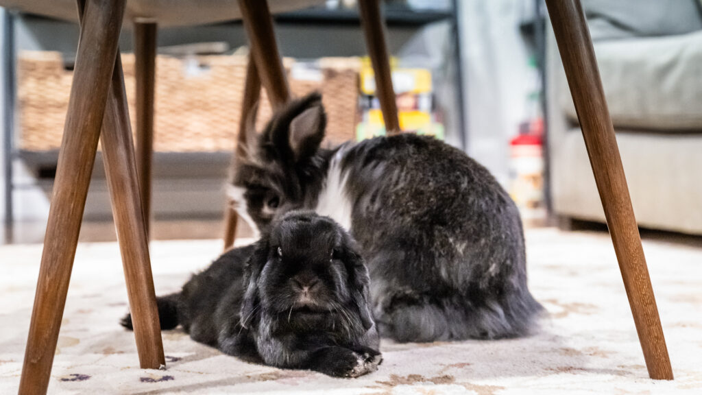 Where do rabbits generally go to feel at home in our homes? The answer is prepositional: on, under, beside, beneath. As in, on your comforter, under the bed, between the fridge and the oven, underneath the piano. Whether indoors or out, rabbits like some or all of the following: a dark burrow-like space, a place in the sun, and a lookout point that commands a view of their domain. Fluffy’s choice locations may pose some logistical or safety problems–how to get her out from under the stove or redirect her penchant for chewing the piano legs. You can bunny-proof her preferred space, and you can take a reading from it to provide a safer substitute.