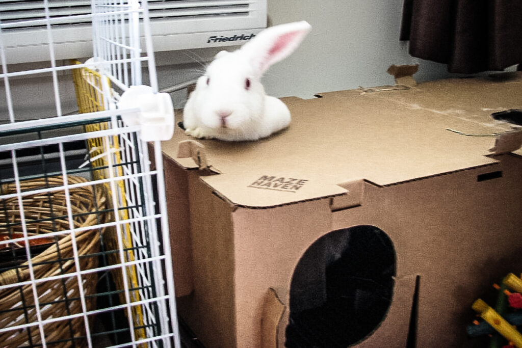Oscar loved to be under the bed. In this private domain he could eat (the wood frame of the box-spring), dig (the carpet), and get some privacy for bathroom activities. Clearly this boy needed his very own fortress of solitude. I foraged the neighborhood supermarket and liquor stores, searching for the special box or boxes that would entice Oscar. I found several likely candidates, low-ceilinged but with plenty of horizontal space where a bunny could kick back. I stocked them with carpet squares, sea-grass mats, and shredded newspaper. I placed one next to the bed and barricaded his former hide-out. Oscar patiently, persistently, obsessively, and ultimately successfully, worked his way back to his sanctum under the bed. I had succeeded in providing him with physical and mental challenges, but clearly I had failed to include some crucial element of the underneath location in my alternative offerings. Back to the stores and then to the drawing board. I went through four set-ups, each more irresistible–or so I hoped–than the one before. Oscar penetrated every obstacle I placed between him and his goal.