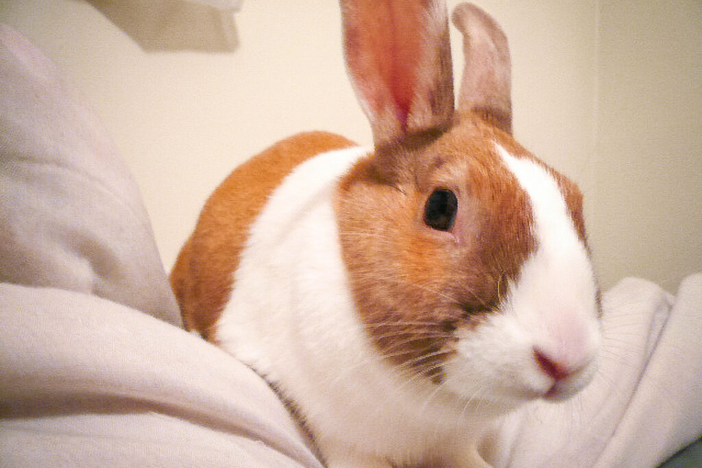 I peered beneath the bushes, and there was your bunny: a red-and-white Dutch, hunched up and staring back at me with the whites of her eyes showing round and bright as the moon.