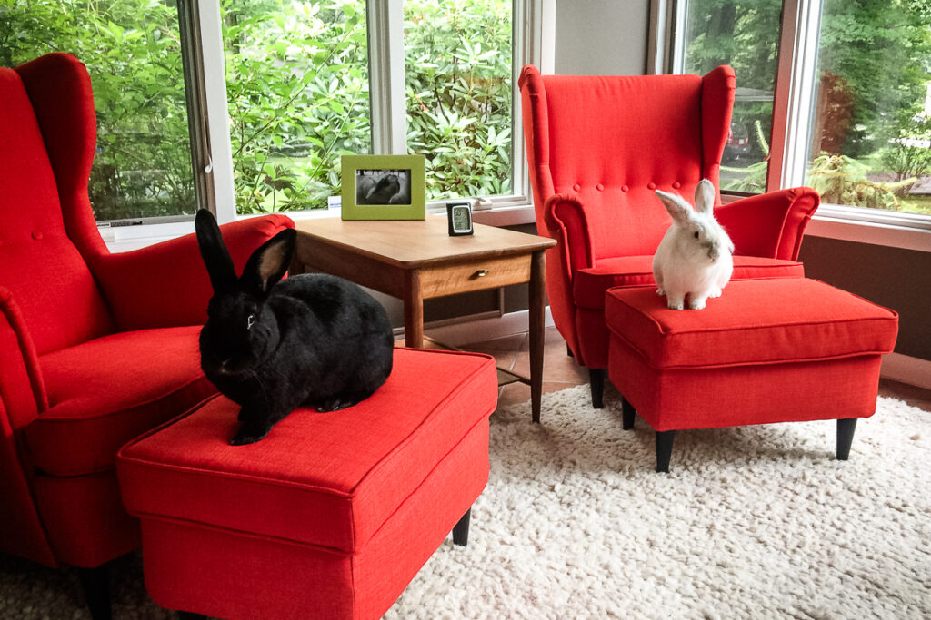 Rabbits are not only adorable with their soft fur and twitching noses but also bring a lot of joy with their playful antics. They have a unique way of expressing happiness, such as performing joyful jumps and twists known as “binkies,” which can be incredibly entertaining to watch. They also do speedy loops around the room that we bunny people call “zoomies.” Their curiosity and playful nature can turn ordinary moments into delightful experiences as they explore their surroundings, interact with toys, and engage in games with their human companions. Watching a pair of rabbits explore, nibble, and hop around can provide endless amusement and comfort, making them wonderful pets for those who appreciate the subtle and endearing ways rabbits express their fun-loving personalities.