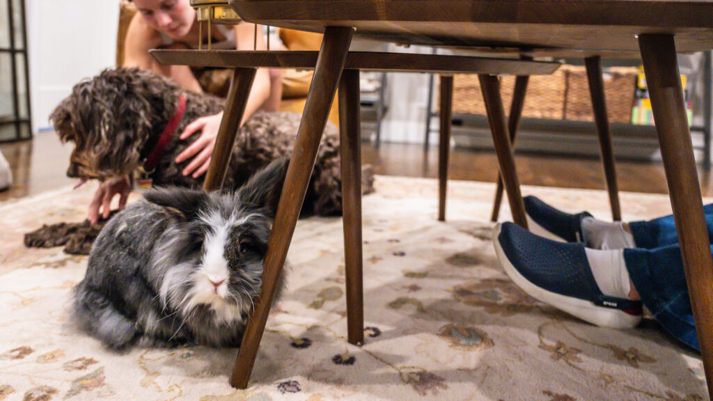 • Designate a safe space for the rabbit that’s out of reach from young hands, using child gates or positioning the cage to allow the rabbit privacy.