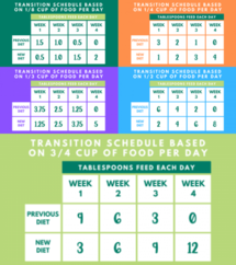 Diet transition charts from Oxbow for different amounts of food per day.