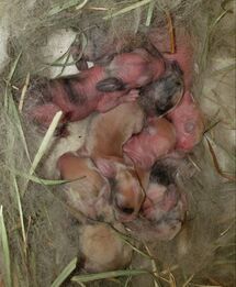 The birthing, or parturition, usually occurs in the early morning during their normal resting period.[5][9] Even in large litters, parturition will take only 10 or 15 minutes.[9] Uncommonly, some births may span 1 to 2 days and still result in the birth of normal kits.[10] The rabbit kits will be born hairless with ears and eyes closed. A mother will sometimes lick the babies as they are born and quickly eat their placentas.[9]