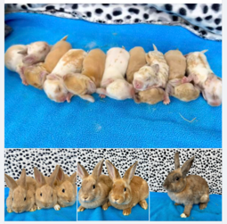 A single mother (bottom right) at K&R Small Animal Sanctuary had three separate litters, each only 4 weeks apart. The oldest litter was a pair (bottom center), the second litter was a trio (bottom left), and the most recent litter had 7 newborns (top).