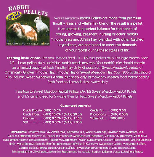 - ↑ Chewy. (n.d.). Sweet Meadow Farm Rabbit Pellets Premium Timothy Blend Rabbit Food. Retrieved 22 Mar 2023 from https://www.chewy.com/sweet-meadow-farm-rabbit-pellets/dp/254335