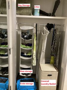 - Store hay, litter, and pellets in overhead shelves or inside storage containers (their hard travel carriers can double as storage!)