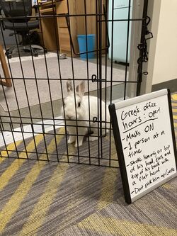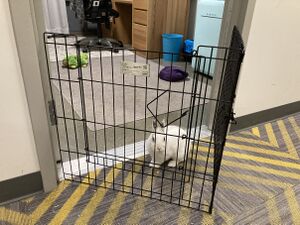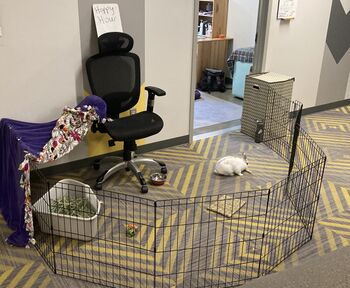If your door opens to a communal space, such as a suite, consider talking to your neighbors and/or RA about having dedicated exercise time in the common area for people to meet your rabbit. Make sure your rabbit has access to your room at all times if they get overwhelmed or want to use the litterbox.