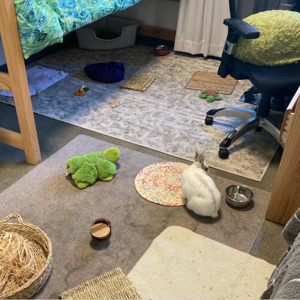 - My rabbit will be housed like ___. To protect my belongings, I bunny-proof like ___. Would you be open to my feedback when you’re setting up your side of the room so I can help you bunny-proof your belongings? Offer help, but do not alter people’s belongings uninvited. For roommates who can’t manage to bunny-proof, you may have to restrict your rabbit from the roommate’s side of the room.