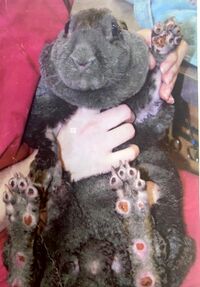 Sore hocks are often found in rabbits housed in wire cages or hutches as well as house rabbits housed on hard floors or carpeting.[1] Large rabbits such as Flemish Giants and angoras, rabbits with shortened guard hairs on their feet like Rexes, and obese, emaciated, or pregnant rabbits are more vulnerable to sore hocks.[2][3]