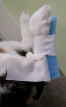 Dr. Materi and Dr. Decibels, from Calgary Avian & Exotic Pet Clinic, created a custom little sandal from a pool noodle.