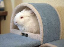 A white lionhead rabbit on the top level of an Armarkat cat tree.