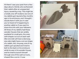A rabbit ended up stuck in a carrot cut-out on their house when spooked and suffered significant swelling in his midsection. Source: East Coast Rabbit Rescue