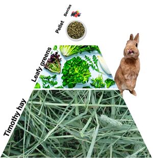 A proper diet is extremely important to the health of a rabbit. Approximately 80% of a rabbit's diet should consist of hay or grass, then vegetables, pellets, and then rarely treats. While pellets can provide a complete source of nutrition when rationed, under no circumstances should you feed only vegetables and/or fruit to your rabbit as a diet. A hay-only diet is not appropriate either as rabbits receive very little nutrition because it passes so rapidly through the gut.[1]