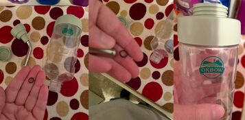 - Place the water bottle above the water bowl.