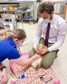 Dr. Liles examines a rabbit on the floor.