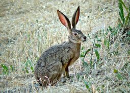 Jackrabbits, also known as hares, (Lepus spp.) typically live alone or in pairs and are native to Africa, Eurasia, North America, and the Japanese archipelago. Hares do not burrow belowground either and prefer to use a shallow depression or flattened nest of grass. Hares are generally larger than rabbits with longer ears and have black markings in their fur. They also have distinctive golden eyes that are not found in domestic rabbits. Certain species of hares may also turn white during the winter.
